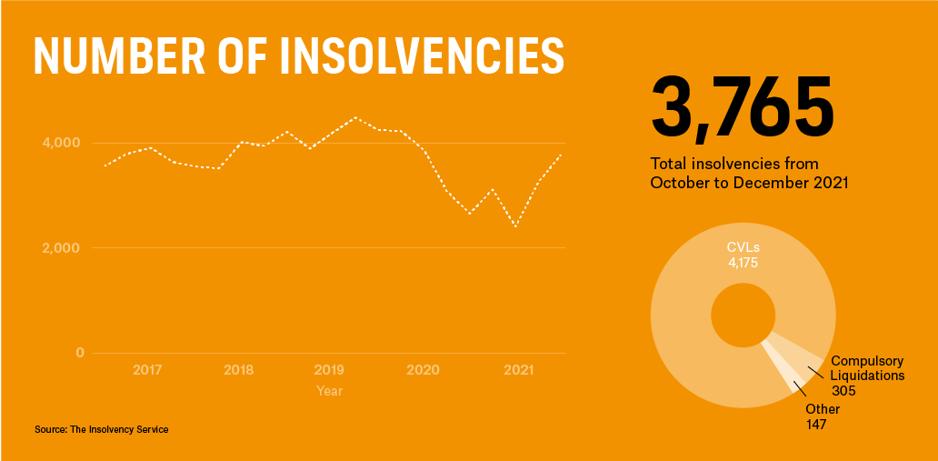 In the final quarter of 2021, the restructuring experts Begbies Traynor reported that 589,168 UK businesses were suffering significant financial distress, a 5% rise on the previous three months. Financially distressed companies are an indicator of future insolvencies now COVID support has been withdrawn. It has also been noted that there was a 106% rise in County Court Judgements (CCJs), a key early sign of future insolvencies as creditors are now actively using courts to recover debts.